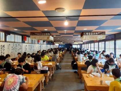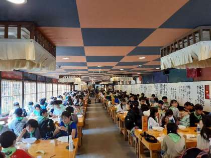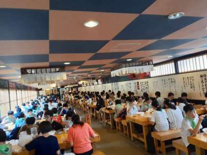 体験が終わった後は、日光江戸村で昼食をとりました。お腹が空いていたのか、子供たちはすぐにカレーライスを食べていました。