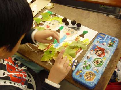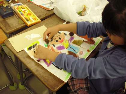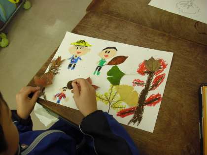 1年生の生活科の授業の様子です。1年生は昨日、2年生といっしょに芦花公園へ「秋さがし」に行ってきました。そのとき2年生の仲良しパートナーさんといっしょに見つけた紅葉した葉っぱや木の実等を使って、絵を描いているところです。子どもたちの絵には自分だけでなく、仲良しパートナーさんや友達の姿が描かれています。友達とかかわり合って活動する楽しさを味わっていることが絵を通して伝わってきます。