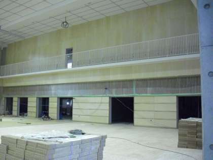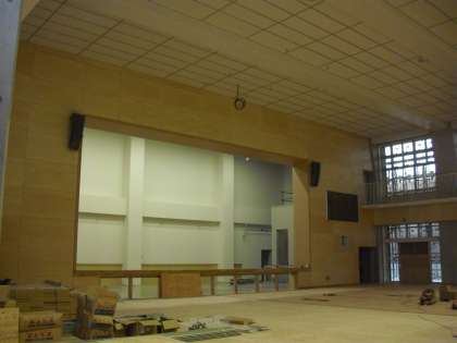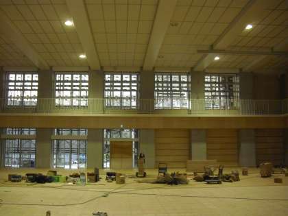 新校舎の体育館の中の様子です。舞台側の右手には旧体育館から引きついだ校歌が掲げられています。天上の高さも小学校の規格としては十分にあります。現在はフロアの板を張り付けている段階です。体育館全体が明るく見えます。工事は順調に進んでいます。