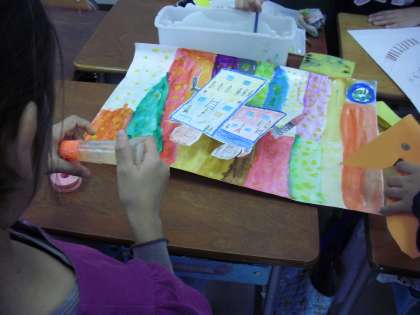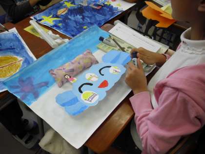3年生の図画工作の授業の様子です。「ふしぎなのりもの」の制作に取り組んでいるところです。画用紙に、自分が行ってみたいところを描いて、乗って行きたい乗り物も自分で考えます。自分が行ってみたい場所を想像しながら描く子どもたちの表情は、とても楽しそうです。希望や夢を表現することはいつまでも大切にしたいことです。