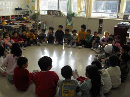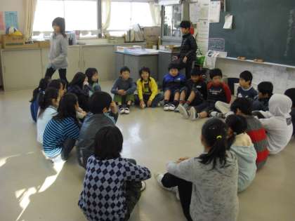 1・3・5年生は室内遊びです。室内遊びの時は全員で丸く輪になる遊びを選んでいる場合が多いです。お互いの顔を見合うことができ安心感も生まれますし、一体感を感じることができます。友達と遊びを通してかかわり合う中で、子どもたちは相互理解を深め、社会性を学んでいきます。