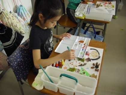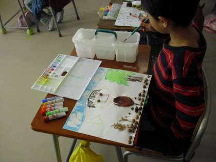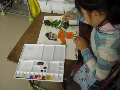1年生の図画工作の授業の様子です。先日の芦花公園での秋さがしで作った葉っぱや木の実を使った絵に、絵の具で色を付けているところです。赤、黄など、秋を感じさせる色をパレットに並べ、筆に付けた水と混ぜ合わせながら画用紙に色を付けていきます。水の量で色も変わってくることも学んできています。水さしの角を使って、筆が吸った水の量を調節していました。