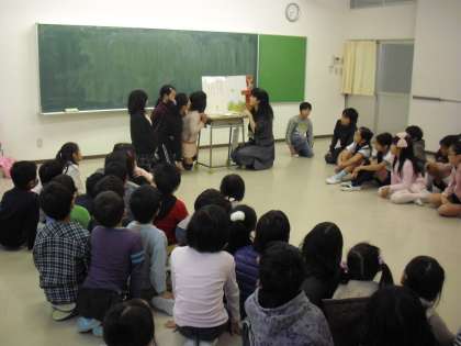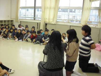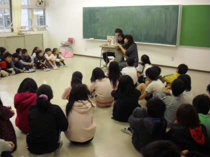 多目的室での様子です。保護者と5年生の子どもたちが協力して、1年生に読み聞かせをしているところです。登場人物で役割を分担し、工夫していました。1年生が入学間もない頃は、朝の時間に6年生が紙芝居を読むこともありましたが、それ以来ではないでしょうか。1年生はお話に夢中でした。また、ふれあいの機会が広がります。
