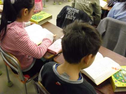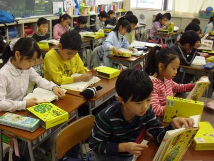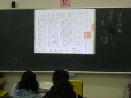 3年生の国語の授業の様子です。漢字事典の使い方を学習しているところです。担任が黒板に大きくページを映し出し、見方を指導しています。子どもたちも一人一人が事典を手に、自分で引きながら学習します。自分が調べたいと思ったことは、様々なツールを使って調べることのできる力を身に付けておくことが大切です。