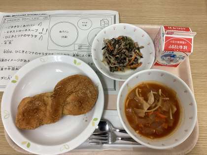 今日は、ごまきなこあげパン、ツナとひじきのサラダ、ミネストローネスープ、牛乳です。