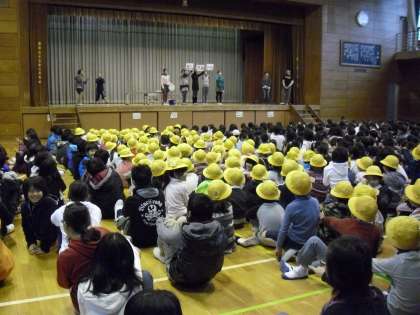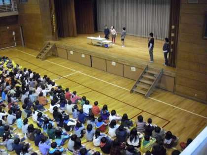 今朝の児童集会の様子です。給食委員会の発表でした。配膳台をアルコールで消毒するようになったことや拭く手順を劇化して表現しました。給食時間に関するクイズも行い、みんなの給食への興味・関心を高める工夫もありました。