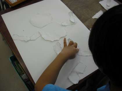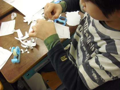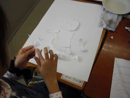1年生の図画工作の授業の様子です。白い画用紙に、体の部位を細かく描き、それを手でちぎっていきます。時間はかかりましたが、丁寧にちぎることができました。ちぎった形を大きな画用紙の上にのせ、なわとびをしている自分を描きます。自分が跳んでいる様子を思いうかべながら、手足の関節を曲げたり、いろいろと向きを試したりして表現していました。