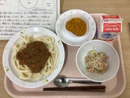 今日は、冷やし肉みそうどん、野菜のごま酢かけ、スイートパンプキン、牛乳です。