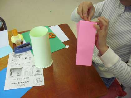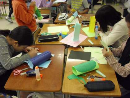 3年生の図画工作の授業の様子です。立体の形を生かして小物入れを作っているところです。単に画用紙を丸めたり、折ったりしているのではなく、子どもたちは形から思考・判断し、何を入れる物か、何が入れられるのかを考え、思い描いたものを実際に表現していきます。えんぴつ立てやティッシュ入れ・・自分の生活と結びつけながら造形活動を楽しんでいます。