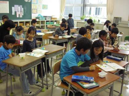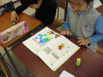 2年生の算数少人数指導の授業の様子です。かけ算を学習しています。2人1組になってかけ算のゲームをしているところです。サイコロを2つ振って、出た目と目のかけ算の答えを言います。答えは事前に教科書にランダムに書きこんでおきます。自分が計算した答えの上におはじきを置いていきます。陣取りゲームのようになっています。これを交互に行っていきます。ちょっとした学習活動の工夫が学ぶ楽しさを広げます。
