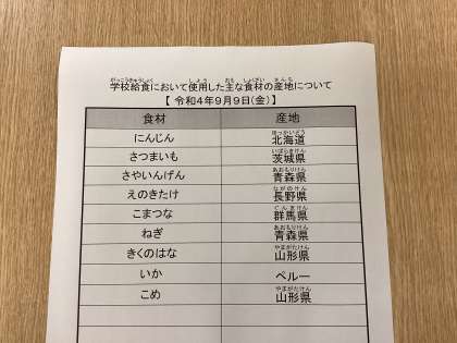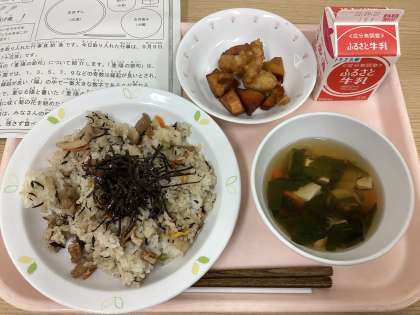 今日は、菊花入り五目ずし、いかとさつまいもの揚げ煮、お月見汁、牛乳です。