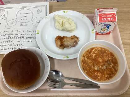 今日は、黒砂糖パン、鶏肉のバーベキューソース、マッシュポテト、トマトと卵のスープ、牛乳です。