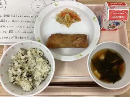 今日は、菜飯、春巻き、わかめ汁、辣白菜、牛乳です。
