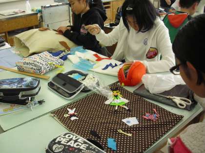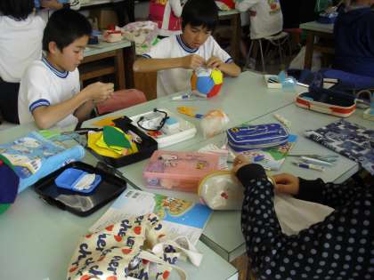 6年生の家庭科の授業の様子です。生活に役立つものの製作に取り組んでいるところです。ほとんどが仕上げの段階に入っています。アップリケで装飾をしたり、糸で刺繍をしたりと工夫にも力が入ります。作品作りに集中しているので静かです。完成するのももう少しです。