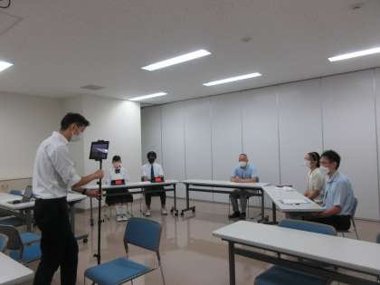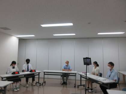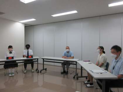 今回は、中学校の生徒会の生徒と小学校の代表児童に学校長からインタビューを行いました。
