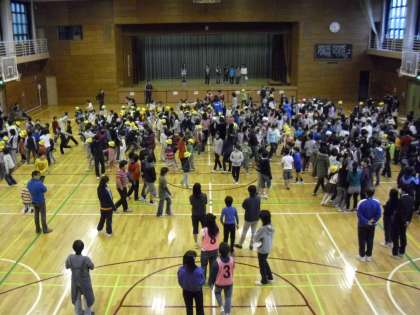 ピンクのゼッケンを着た集会委員会が、中央のラインに立って、○と×の境界線をつくります。「連合運動会で、6年生は3クラスとも上位に入賞した種目がある。○か×か」「今年の1年生は104人でスタートした」等、移動しながら同学年や異学年とかかわり合いながら楽しい時間を過ごしました。