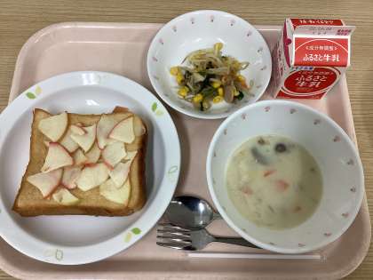 今日は、アップルトースト、小松菜とウインナーのソテー、森のチャウダー、牛乳です。