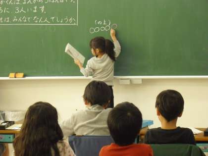 1年生の算数の授業の様子です。「たすのかな ひくのかな」の学習で文章問題に取り組んでいるところです。「子どもが一列に並んでいます。たけしさんは前から5番目です。後ろに3人います。子どもはみんなで何人いるでしょうか」という問題文です。子どもたちは、これまでの学習で学んだことを生かして、ノートに絵図を描いて考えます。意味理解をする上でとても大切な過程です。