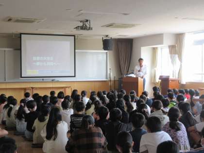 講師として、法政大学経済学部教授で、バルセロナオリンピックに出られた杉本龍勇先生をお招きして、夢を持つことの大切さや、夢を実現するためには何が必要かなどについて、貴重なお話しを聞くことができました。