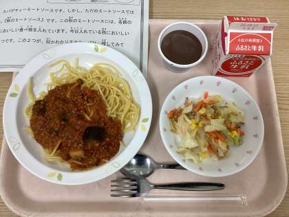 今日は、秋のスパゲティーミートソース、ごぼうチップサラダ、ココアプリン風、牛乳です。