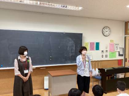 絵本とおはなしの会「たんぽぽ」から、高橋さんと荒木さんが来校し、絵本の読み聞かせをしていただきました。