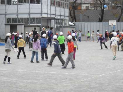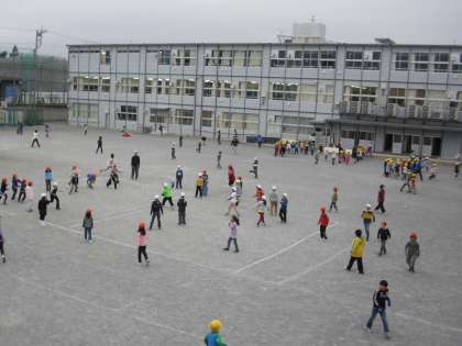 今朝の学級遊び「みんなでたのしく」の様子です。校庭で遊んでいるのは1年・3年・5年生です。1年生は、長なわ跳びをしています。3年生はドッジボールやおにごっこ、5年生もおにごっこ系の遊びをしています。寒さをふきとばすほど元気な子どもたちです。