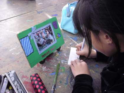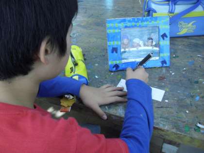 6年生の図画工作の授業の様子です。オリジナルの写真立てが完成する人も出てきました。自分の作品を紹介するカードを書いているところです。写真立てには、お気に入りの一枚の写真が入っています。工夫した写真立てで、その一枚がさらに輝きます。