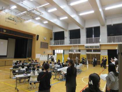 質疑応答の時間では、グループごとにまとめた意見を聞き、たくさんの疑問が出されました。みんなで、協力して答えを出そうと頑張っていました。