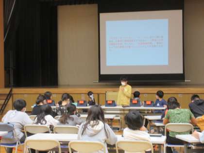 10月17日(月)5校時、体育館では、5年2組の総合的な学習の時間「こちら情報インフルエンサー たいやき集団」の学習が行われていました。