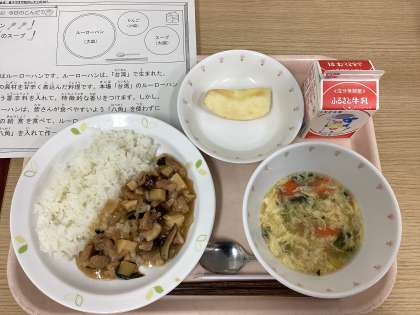 今日は、ルーローハン、コーンと卵のスープ、りんご、牛乳です。