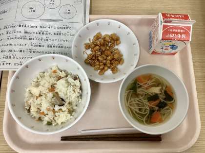 今日は、鯛めし、大豆とじゃこの甘辛揚げ、そうめん汁、牛乳です。