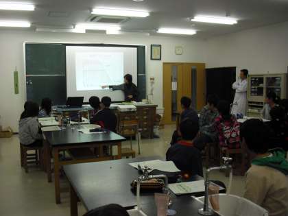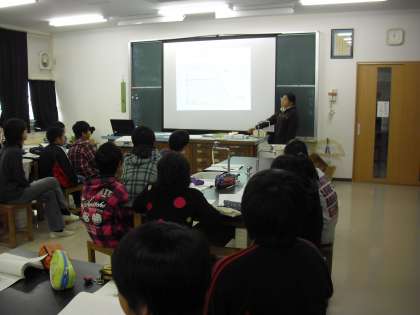 6年生の理科の授業の様子です。芦花中学校の和田副校長の特別授業です。地層のでき方について学習した後に、提示された地層がどのようにできたのかをグループ毎に話し合い、代表者がプレゼンテーションをしているところです。投影された図を活用しながら分かりやすく説明しています。これも言葉の力をはぐくむ取組みにつながります。