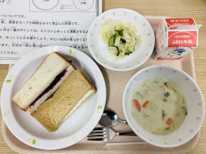 今日は、二色サンド、イタリアンサラダ、さつまいものクリームシチュー、牛乳です。