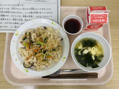 今日は、ビビンバ、わかめスープ、ぶどうゼリー、牛乳です。