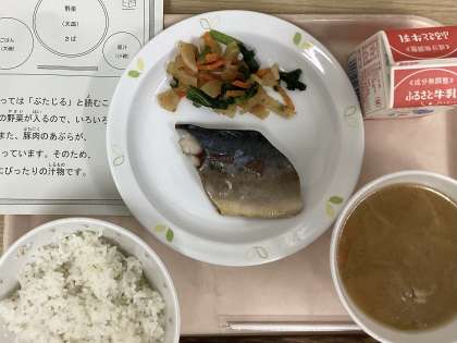 今日は、麦ごはん、さばの塩焼き、野菜の梅おかか和え、豚汁、牛乳です。
