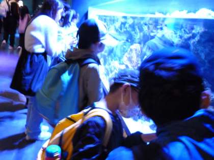 子どもたちは、調べてきた魚がどこにいるのか楽しみながら見て回りました。大きなエイやマンタ、イルカショーなどを見て楽しみました。なかなか見ることができない魚たちを見ることができ、貴重な体験でした。