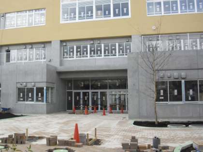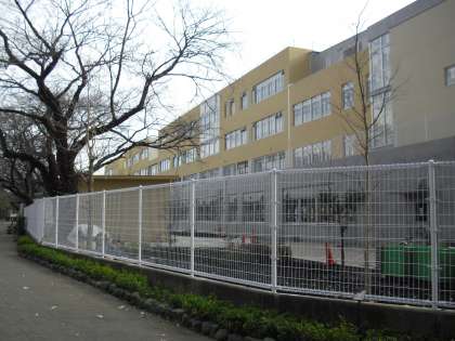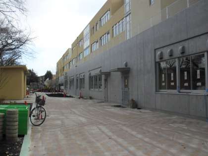 遊歩道沿いのフェンスが取り外され、新校舎の外観がよく見えるようになりました。写真は中学校棟から写したものです。今日は、日曜日で工事はお休みですが、フェンス越しに校舎外周の工事の状況も確認できます。