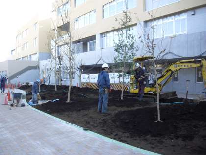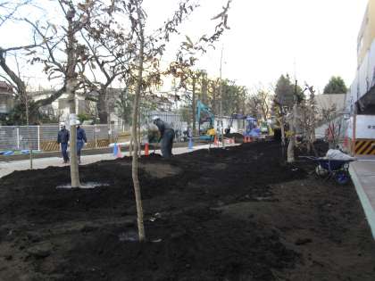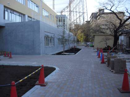 新校舎建設工事の様子です。これは北門から入ってすぐのところです。まだ北門はできてはいませんが門をくぐって広いスペースに出ます。植樹も進んでいます。地面に使っているタイルも芦花公園の町並みに合わせた色になっています。