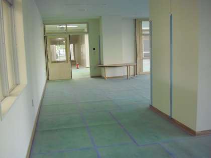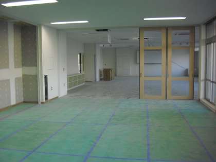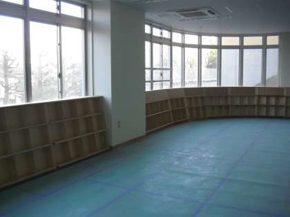 2階にある図書室の様子です。図書室は小学校の北側の昇降口階段を上がった右手にあります。外観からは丸みを帯びているのですぐに分かります。図書室の隣はパソコン室ですが、現在はまだ空間の状態です。