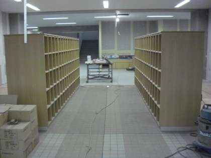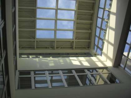 図書室を出ると2階の玄関ホールです。子どもたちが校舎に出入りする場所です。ここで靴を履きかえます。ホールは吹き抜けになっています。日差しが降り注ぐ明るい玄関です。