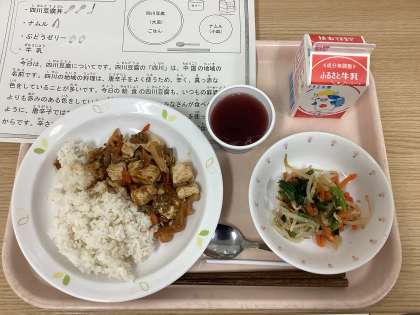 今日は、四川豆腐丼、ナムル、ぶどうゼリー、牛乳です。