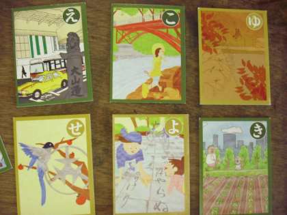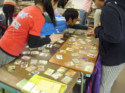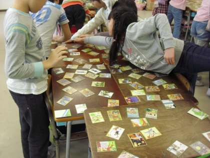 3年生の日本語の授業の様子です。「せたがやかるた」でかるた遊びをしているところです。このカルタの読み句は、世田谷区内の小学生を対象として、世田谷の見所をイメージした読み句を募集した中から選ばれた88句から作成されています。絵札のイラストは多摩美術大学の学生さんが読み句の内容をイメージして描いたものです。子どもたちは、友達と仲よくかかわりながら、世田谷めぐりを楽しんでいました。