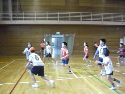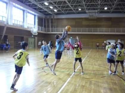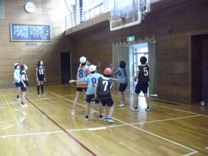6年生の体育の授業の様子です。体育館でバスケットボールをしているところです。バスケットボールはボールを持ったチームが相手のゴール目指してパスやドリブルでボールを運び、シュートをします。ボールを持ったときや奪われたときの攻防の切り替えが必要な運動です。仲間と声を掛け合いながらパスをつないでいました。