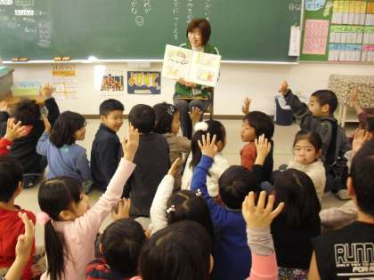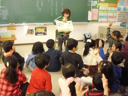 今朝の読み聞かせの様子です。これは渡部校長が1年生に読み聞かせをしているところです。2冊の本を用意しました。1冊は、楽しいお話。もう1冊は、三択のように子どもたちと対話をしながら進める「ねえ、どれがいい」というお話でした。「きみんちのまわりがかわるとしたら、大水と、大雪と、ジャングルと、ねえ、どれがいい?」渡部校長が子どもたちに尋ねます。「は〜い!」自分の思うものに元気よく手を挙げる子どもたち。読み聞かせを通して、コミュニケーションを交わしながら楽しくかかわることができました。