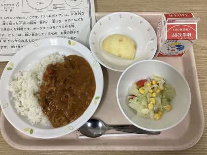 今日は、パセリライス、ポークストロガノフ、イタリアンドレッシングサラダ、りんご、牛乳です。