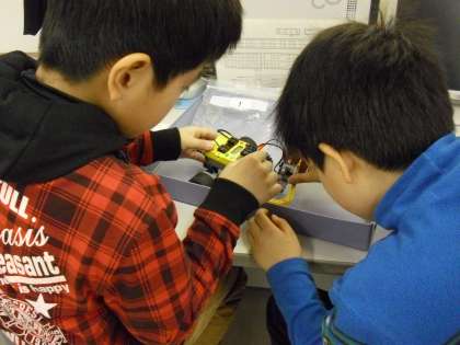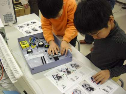 今日行ったワークショップ「ロボット&プログラム体験教室」の様子です。サマーワークショップでも行った講座です。今回は、4〜6年生の20名が受講しました。2人1組となって、車型のロボットを組み立てていきます。