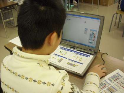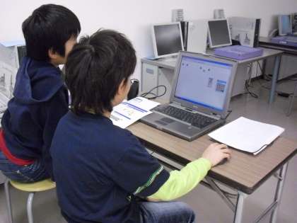 ロボットを動かすプログラムを作成している様子です。「前へ○秒進む」等、具体的な命令をプログラムしていきます。はじめは、全員で同じ基本的なプログラムを作成し、プログラムの仕方を学んでいきます。