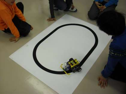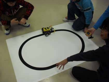 最後に同じコースを40秒で走るレースをすることになりました。40秒で+−で40秒に近いチームの勝ちです。スピードや走り方を工夫しながらストップウォッチを片手に走らせてはプログラムを調整していきます。