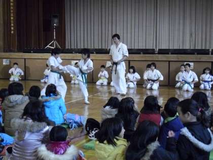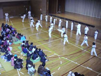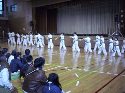 「ROKA SHOW」の審査の間、空手部の演武が行われました。気合いを入れた迫力のある演武に、会場も先ほどとは違う雰囲気となりました。気合いを入れる声が体育館に響きわたります。組手など、見ている側も真剣になります。