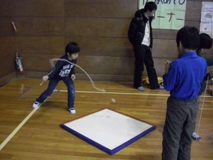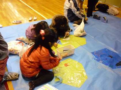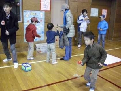 体育館後方のBOPの昔遊びコーナーです。子どもたちはコマ、けん玉、ビニールだこづくりを楽しんでいました。ベーゴマなどのなつかしい遊びもありました。作ったビニールだこは、校庭で上げて遊びました。昔遊びを通して友達と仲良くかかわりました。